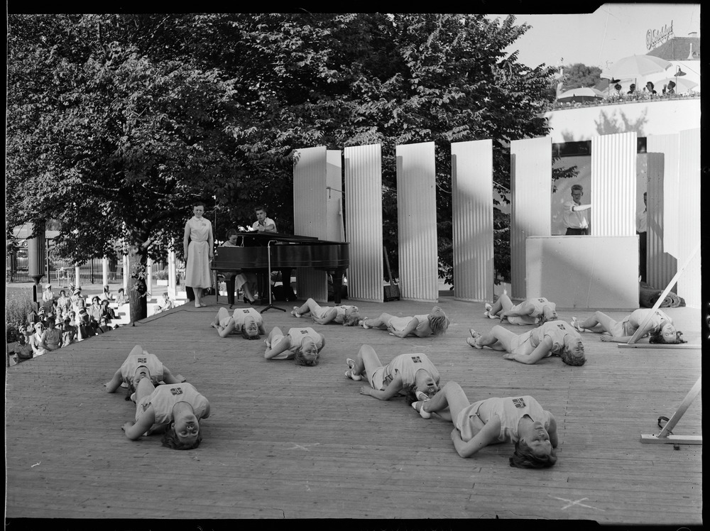 Bilden föreställer en scen med elva stycken kvinnor klädda i gymnastikdräkt liggandes på rygg. I bakgrunden skärmar och ett träd. Där står också en flygel med pianist och ytterligare en kvinna.