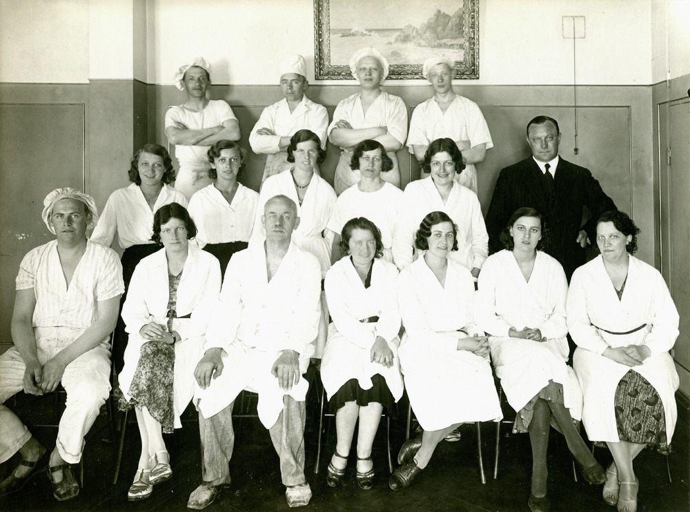 Gruppbild på Christian Klintamn och bagarna på Klintmans konditori. Bilden är troligen tagen på innergården till Kullagatan 13.