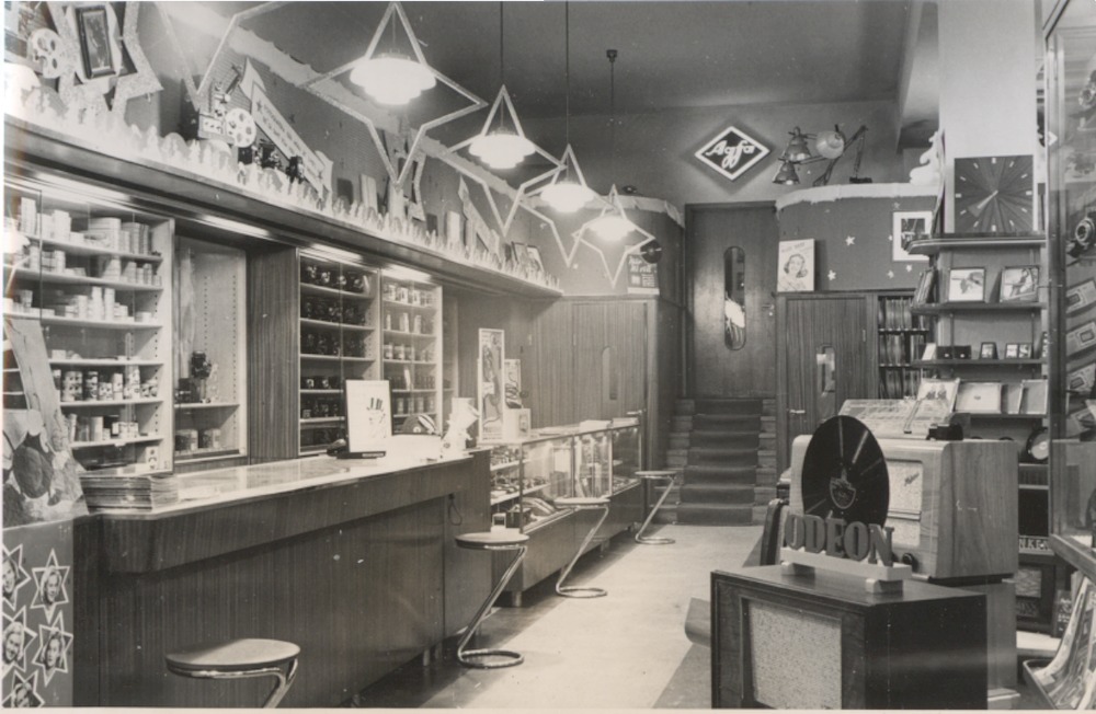 Fotografi som avbildar fotoavdelningen med juldekorationer i Hefomas affär på Järnvägsgatan 3. Tagen före ombyggnaden av affären 1957-58. På den bakre väggen ser man även dörrarna till båsen som man kan lyssna på grammofonskivor ostört. Dessa dörrar är bevarade, se; 2790 och 2791-2020.