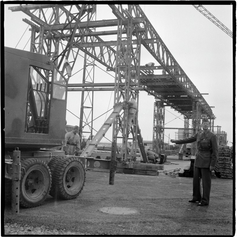 Bilden föreställer en stomme, ett regelverk till en byggnad. I förgrunden en del av en lastbil samt en man. (gångbro?)