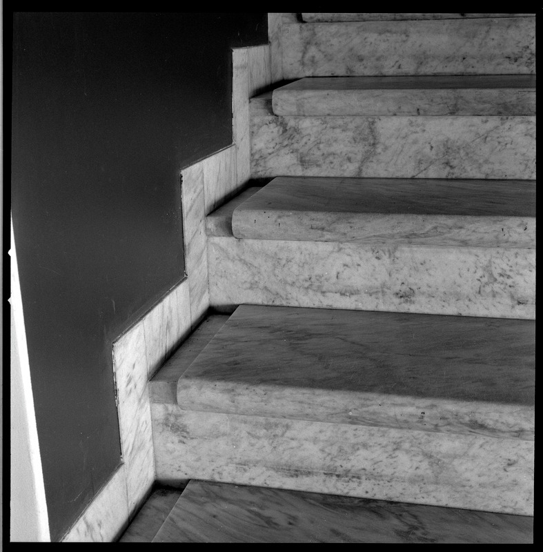 Bilden föreställer fyra trappsteg i en innertrappa, stenmaterial.