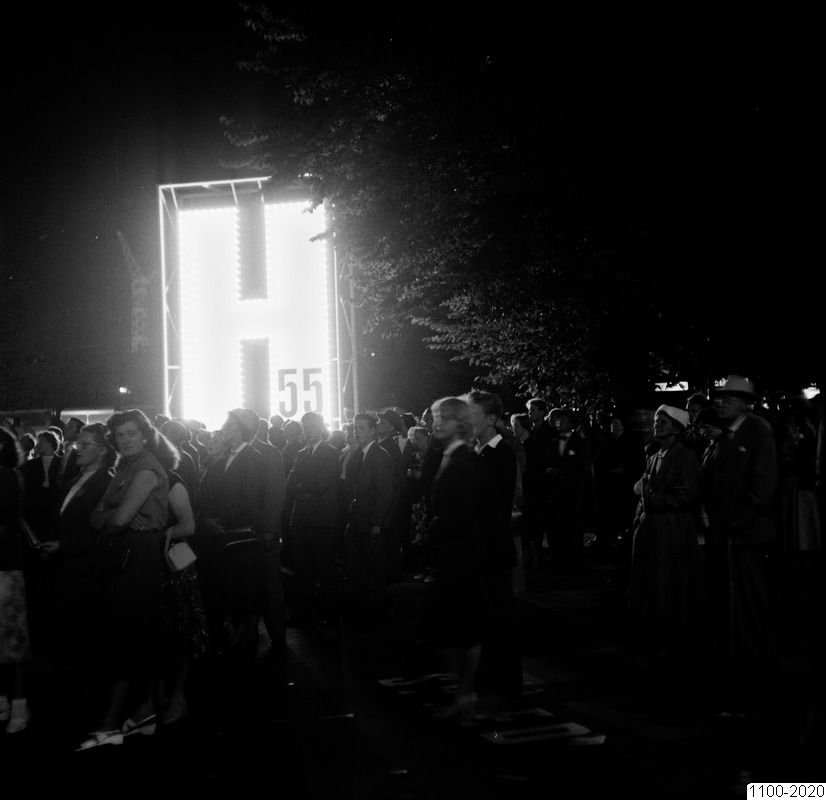 Bilden föreställer en folksamling framför en H55 skylt vid entré på Gröningen.