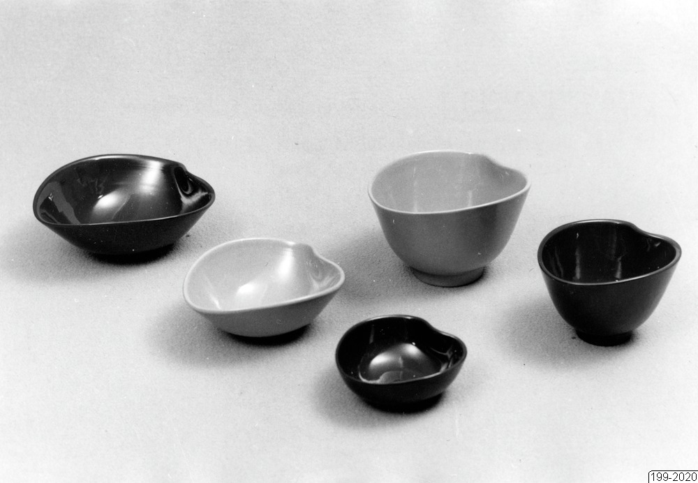 Bilden föreställer "Taffel" Färgglatt ugnseldfast hushållsgods. Färger: oliv, viol, rost, gul, svart. Utföarnde S.O. Burmeister. Fem stycken skålar i olika storlek och i ljusa och mörka färger.