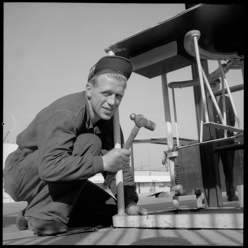 Bilden föreställer en man som sitter på hhuk med en hammare i handen vid en konstruktion av något slag.