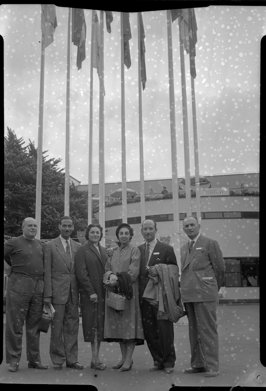 Bilden föreställer fyra män och två kvinnor i helfigur. I bakgrunden flaggstänger och byggnad.