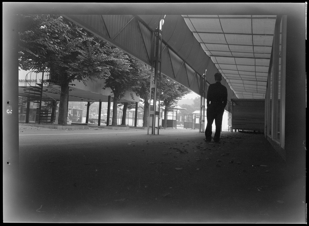 Bilden föreställer överbyggda gångbanor och mellan dem träd. En man kommer gående.