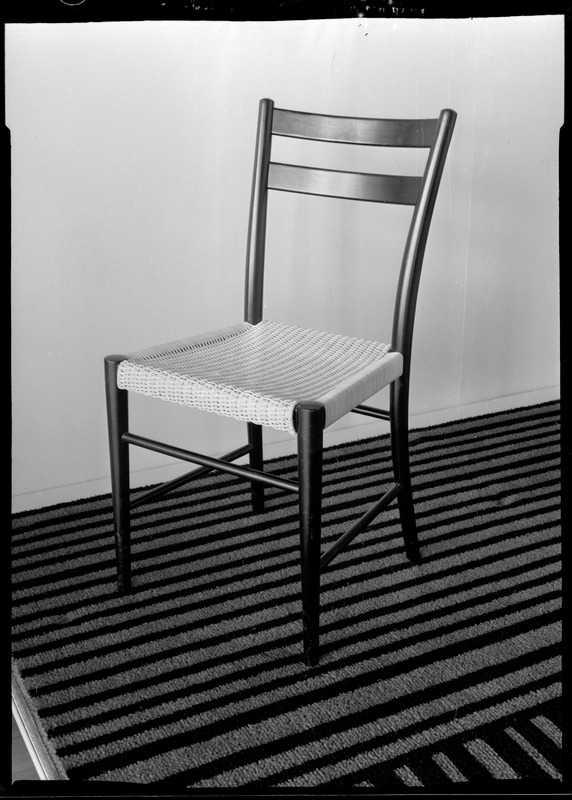 Bilden föreställer en stol stående på en randig matta, svart bakgrund.