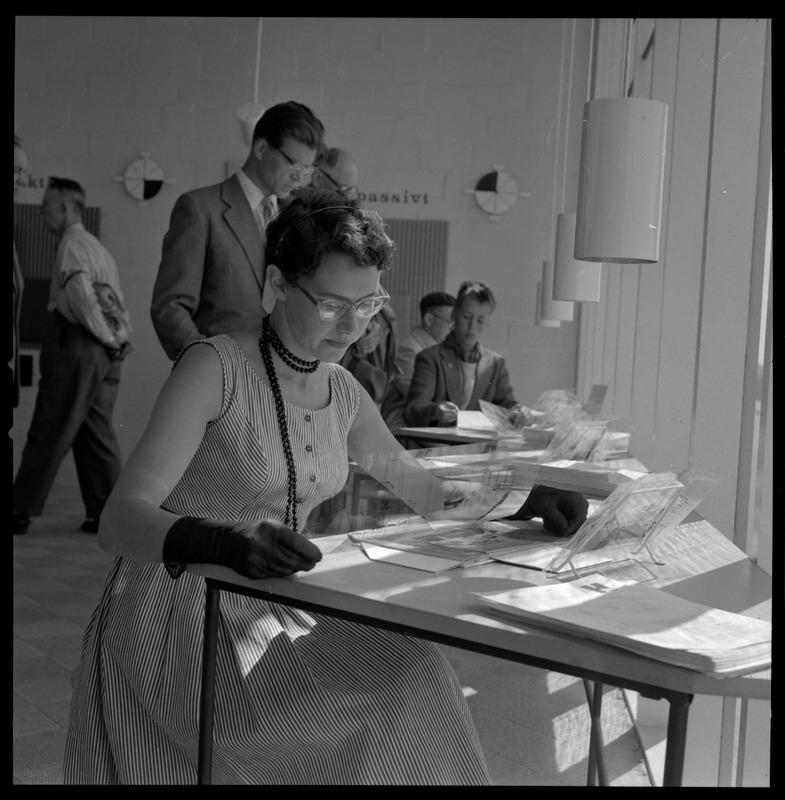 Bilden föreställer en kvinna som sitter vid ett bord med troligen böcker och bilder på. I bakgrunden liknande bord samt ytterligare människor.