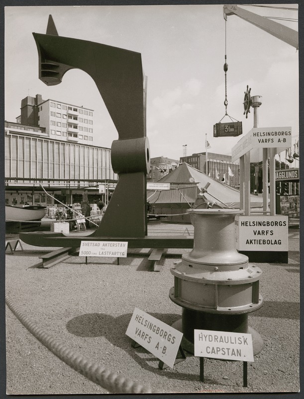 Bilden föreställer Helsingborgs varfs AB Monter på Sjöfartsutställningen. På skyltar står deyt Svetsad akterstav till 5000 ton Lastfartyg samt hydraulisk capstan.