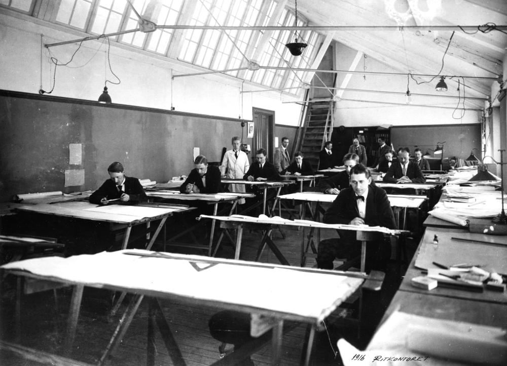 Avbildar ritkontoret på Elektromekano i Helsingborg. Fotografiet är daterat 1916. John Blom började sin karriär på Elektromekano på ritkontoret. Senare arbetade han som fotograf på samma företag.
