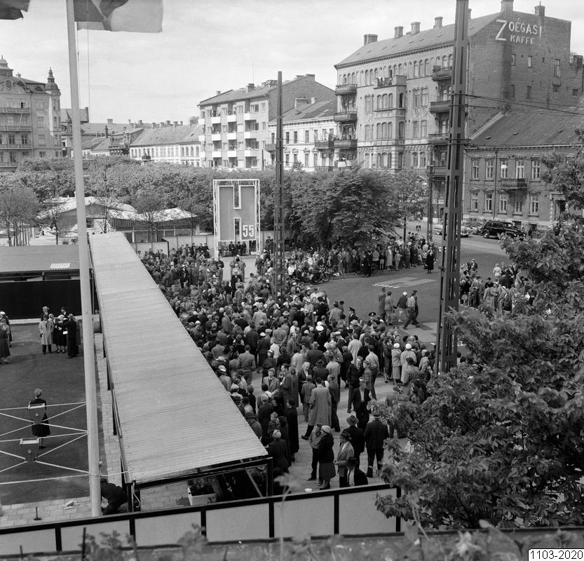 Bilden föreställer kön vid entrén till H55. I förgrunden man i hatt och man i uniform.