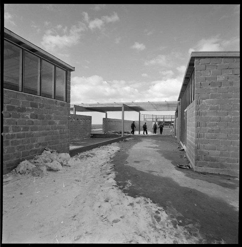 Bilden föreställer färdigbyggda paviljonger och mellan dem helt obearbetad mark. I bakgrunden överbyggd gångväg med några personer.