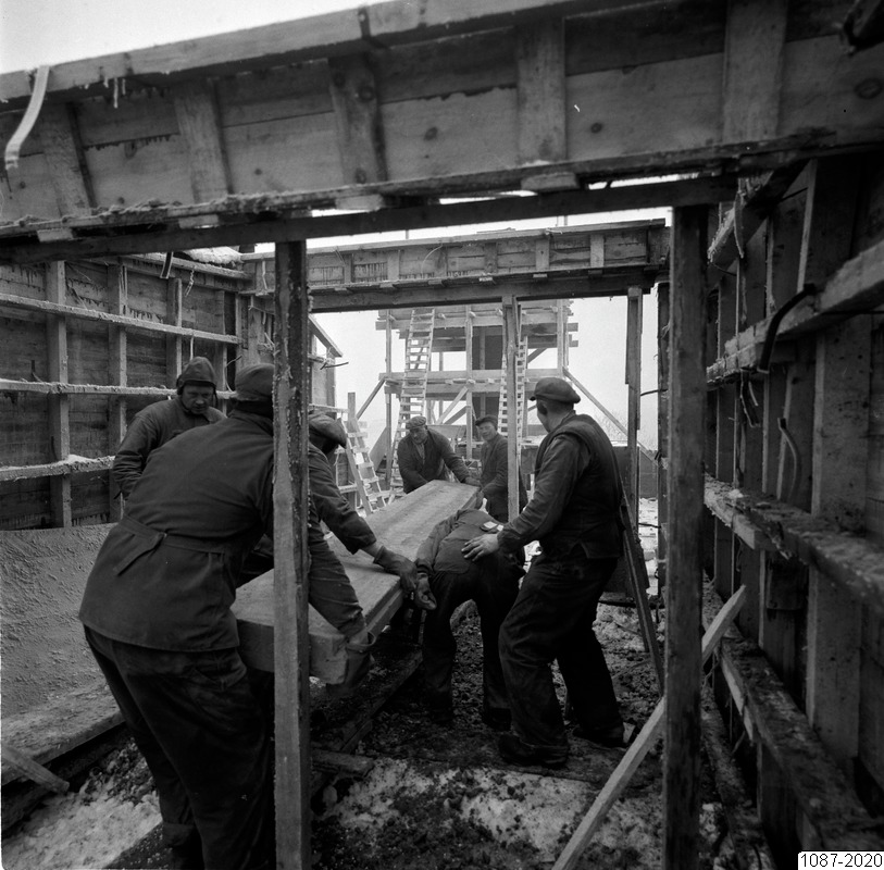 Bilden föreställer fyra byggnadsarbetare inuti ett utrymme under uppbyggnad med väggar, tak och golv.