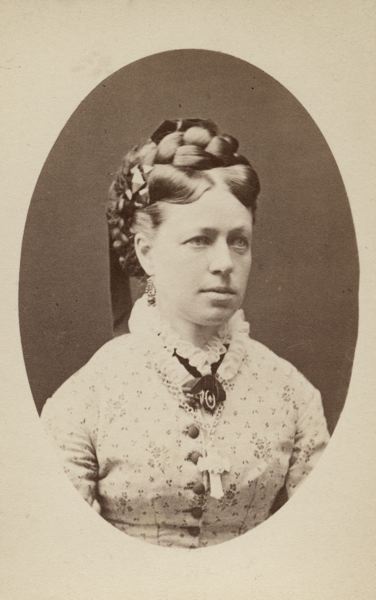 Visitkortsporträtt i svartvitt som avbildar konsulinnan Amalia Flyborg. Hon har en avancerad håruppsättning med fläta lagd över hjässan. Hon bär örhängen och halsband.