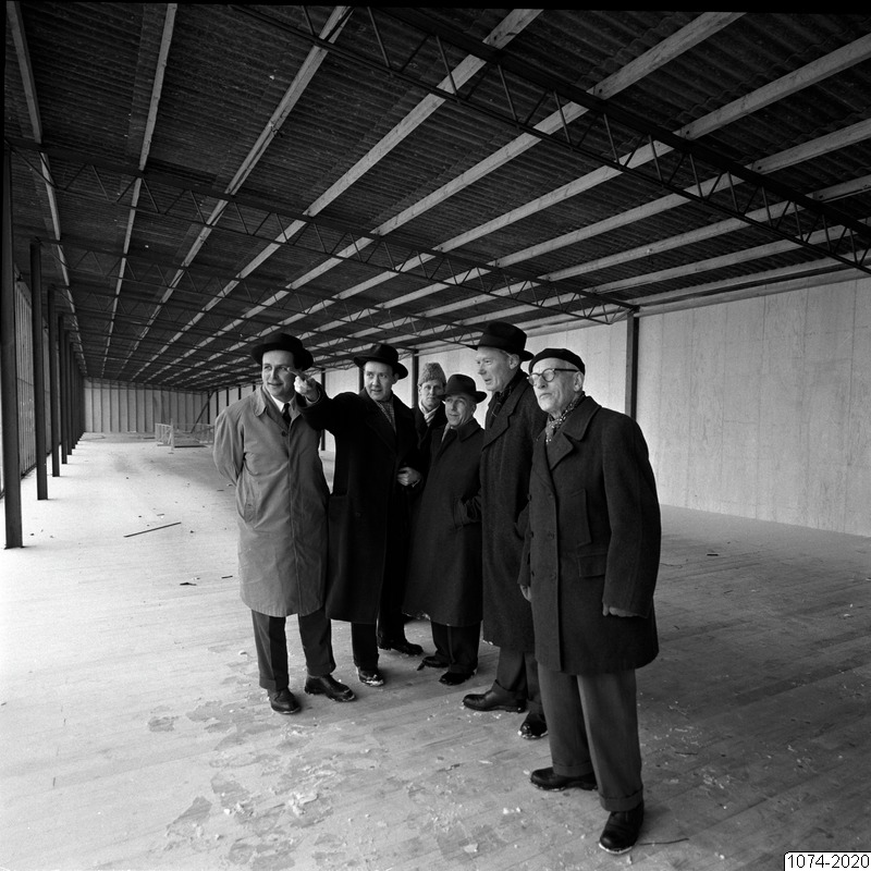 Bilden föreställer sex herrar fotograferade i helfigur stående under ett tak.