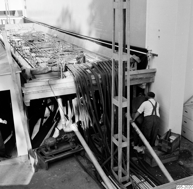 Bilden föreställer en husfasad till höger. Mitt i bild rör och bassäng med vatten troligen en fontän. I förgrunden ett utryme före bassängen, från vilken det hänger slangar. På golvet står en motor och där är två människor.