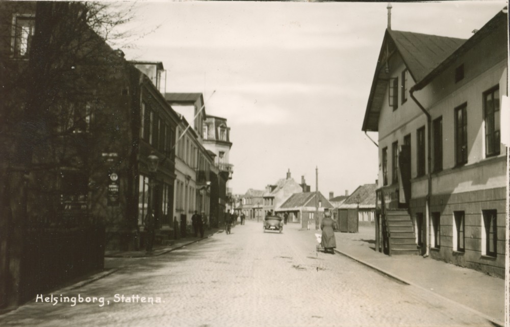 I förgrunden kullerstenslagd gata, med tvåvånings hus på sidorna.