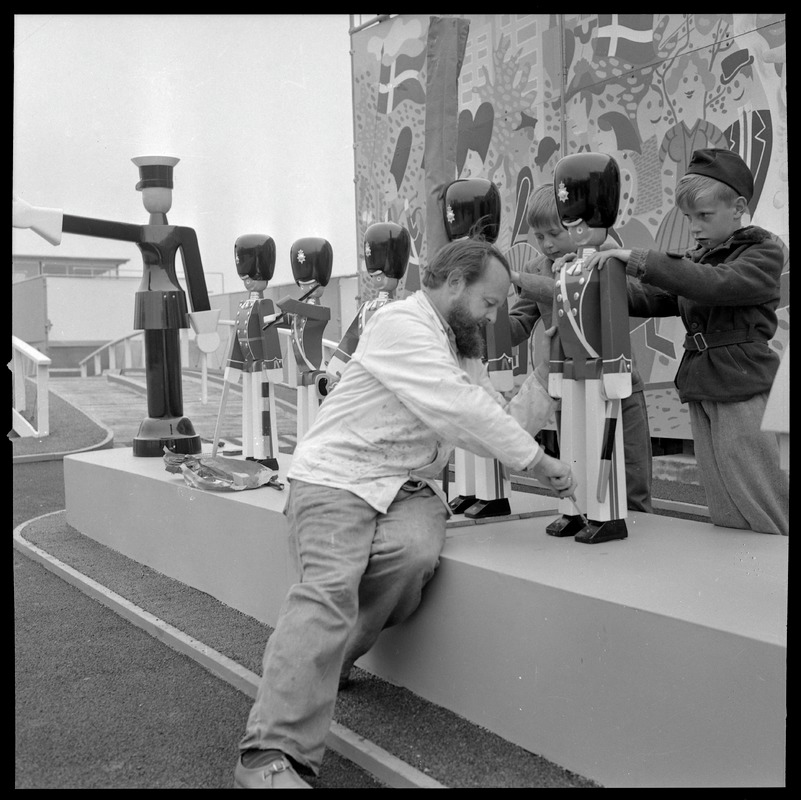Bilden föreställer fem trädockor iform av danska militärer samt en sjätte docka iform av en polis som pekar med ena armen. Dockorna rättas till av en man och två barn. Dockorna står på ett podium, bakom dem en fasad som är målad med en bild.
