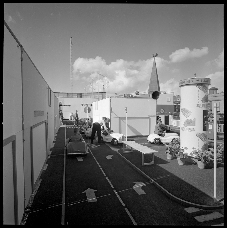 Bilden föreställer en del av en trafikskola med vägar, vägmärken samt bilar med barn i.