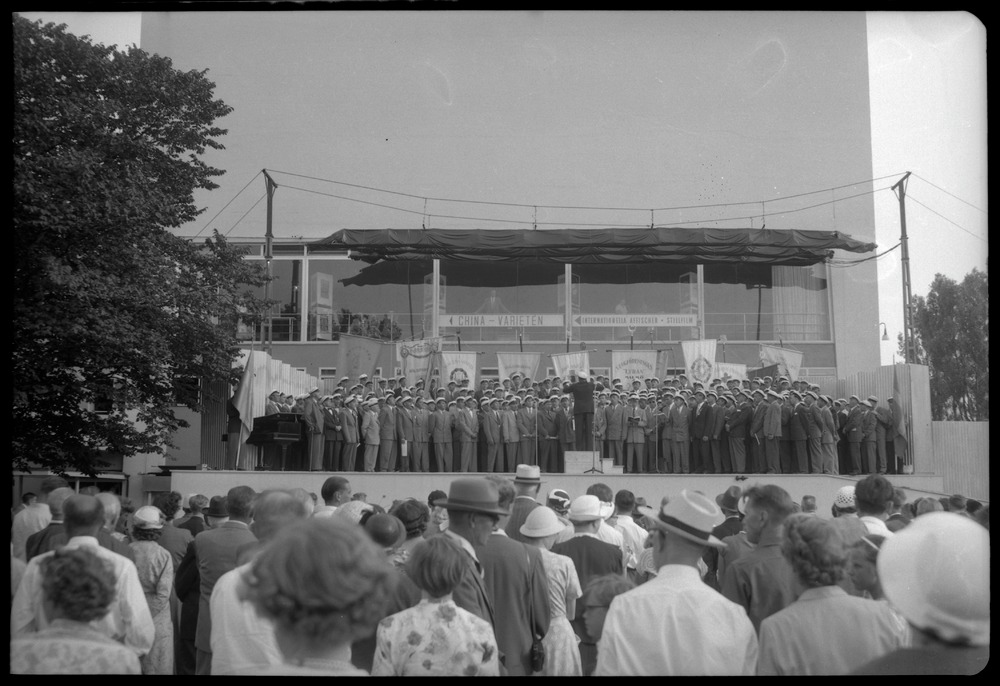 Bilden föreställer en manskör tillika studentkör stående på en scen framför ett antal fanor. Alla sångarna har studentmössa på sig och leds av en dirrigent. I förgrunden publik fotograferad bakifrån