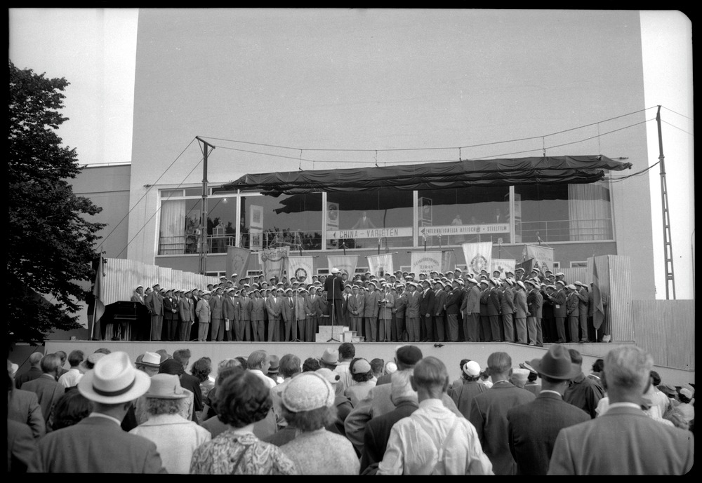 Bilden föreställer en manskör tillika studentkör stående på en scen framför ett antal fanor. Alla sångarna har studentmössa på sig och leds av en dirrigent. I förgrunden publik fotograferad bakifrån