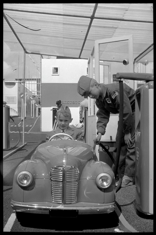 Bilden föreställer en bil och två barn i en byggd trafikskola med vägar