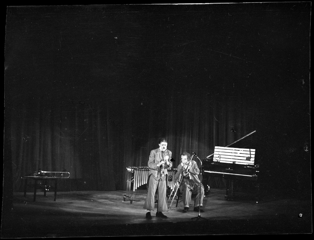 Bilden föreställer två män på en scen. Männen är sminlkade som clowner och spelar på varsitt blåsinstrument, bakom dem ytterligare instrument.