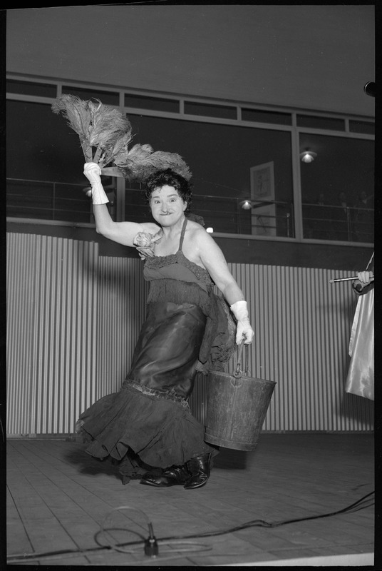 Bilden föreställer en kvinna i långklänning och handskar. I ena handen en fjädeplym och i andra handen en hink. Kvinnan står på en scen.