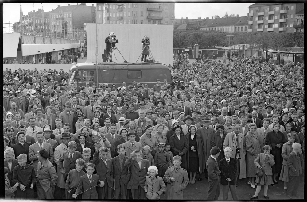 Bilden föreställer en stor öppen yta fylld med stående människor som tittar mot en scen. I bilden en folkvagnsbuss på vars btak det står två personer med kameror på stativ. I bakgrunden byggnader.