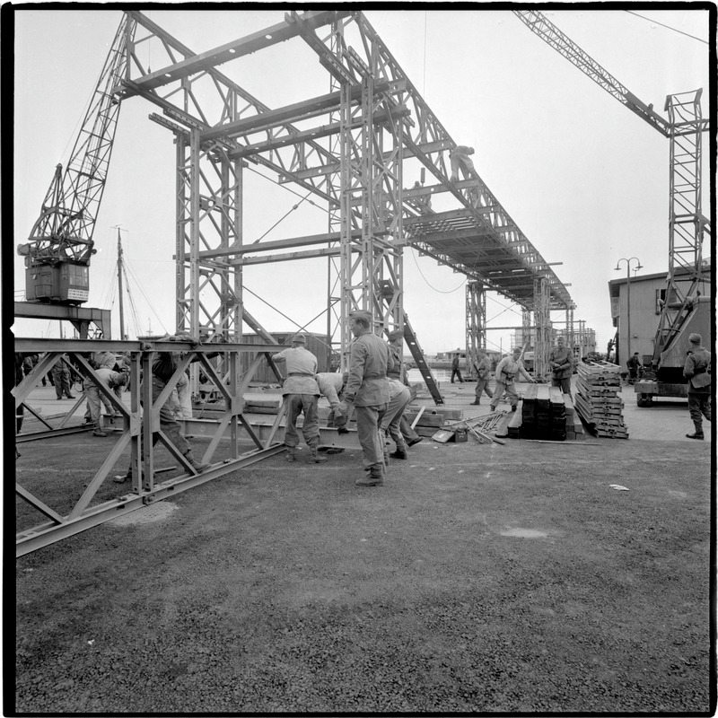 Bilden föreställer en öppen yta med ett staket och flera byggnadsarbetare. I bakgrunden konstruktion (gångbro?) samt en lyftkran.