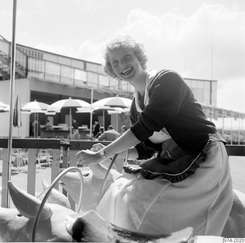 Bilden föreställer en kvinna sittandes på något lekredskap/karusell. I bakgrunden paviljong med uteservering.