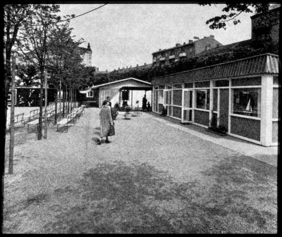 Bilden föreställer en öppen grusplan, till höger och i bakgrunden enpalsnbyggnader. Till vänster planterade träd och mellan dem bänkar. På grusplanen går några människor.