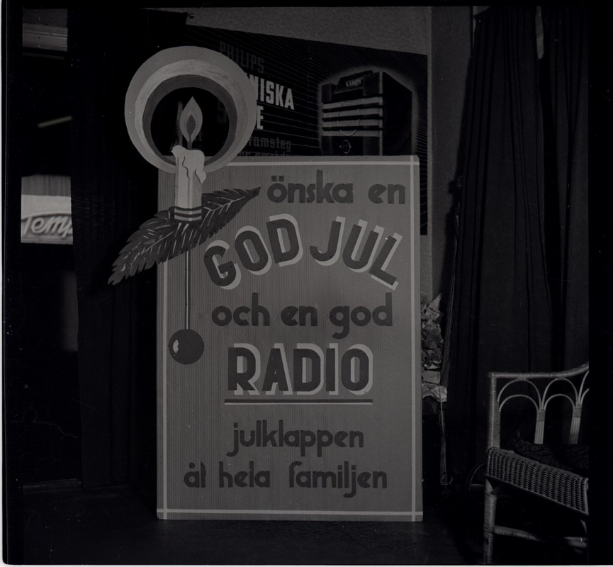 Fotografi som avbildar en juldekorerad reklamlapp, den kan även ses hängandes i ett skyltfönster, se: DIG_2020_705. Troligen taget före ombyggnaden av butiken.