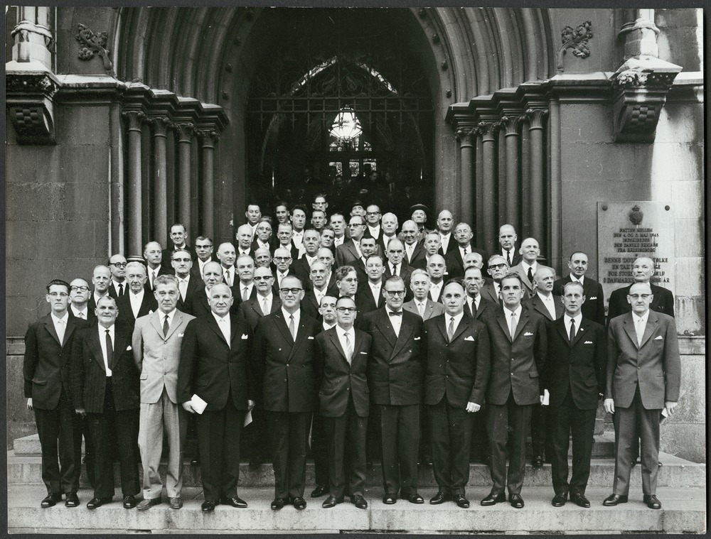 Bilden föreställer ett porträtt av män i kostym uppställda i en trappa i en port till en byggnad, åtminstone 63 stycken.