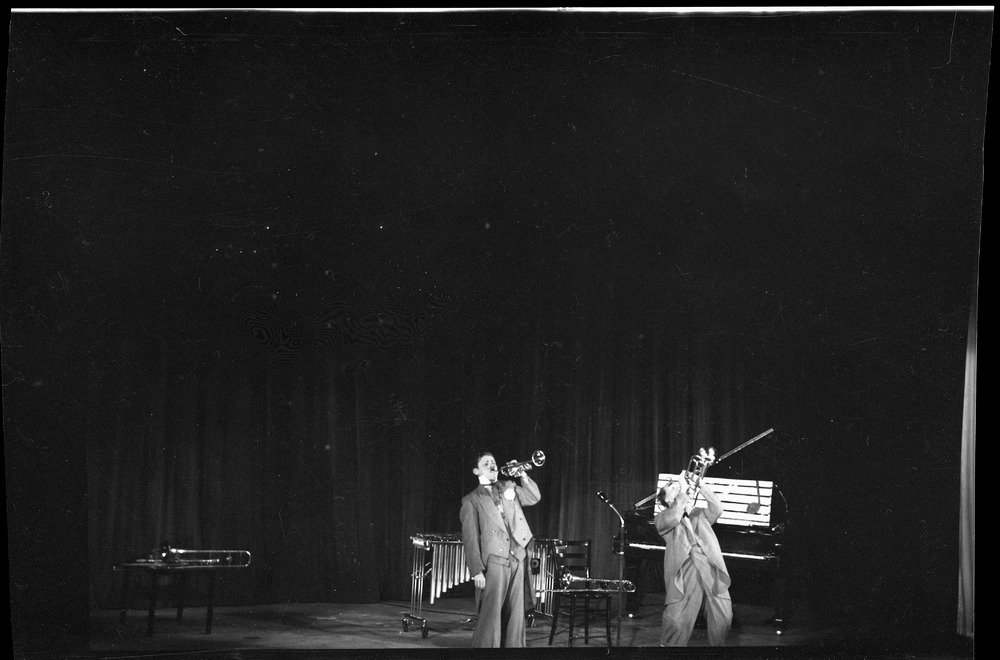 Bilden föreställer två män på en scen. Männen är sminlkade som clowner och spelar på varsitt blåsinstrument, bakom dem ytterligare instrument.