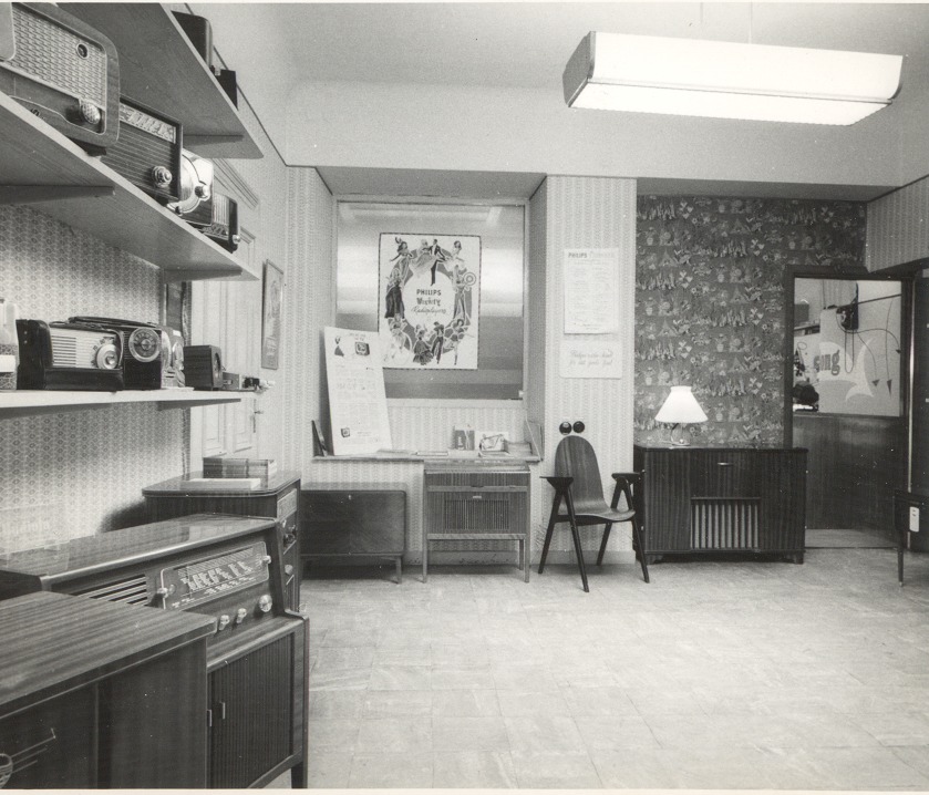 Beskrivning: Fotografi som avbildar radio avdelningen i Hefomas affär på Järnvägsgatan 3 före ombyggnaden 1957-58. Bilden var daterad "1/4 1955".