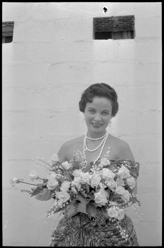 Bilden föreställer en kvinna, sångerska(?), fotograferad i trekvartsfigur framför en vägg. I famnen har kvinnan en stor bukett blommor.