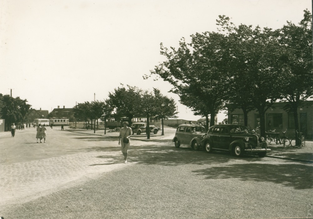 I förgrunden en bred gata. Till höger parkerade bilar. Gatan är omgiven av träd. Långt i bakgrunden en spårvagn.
