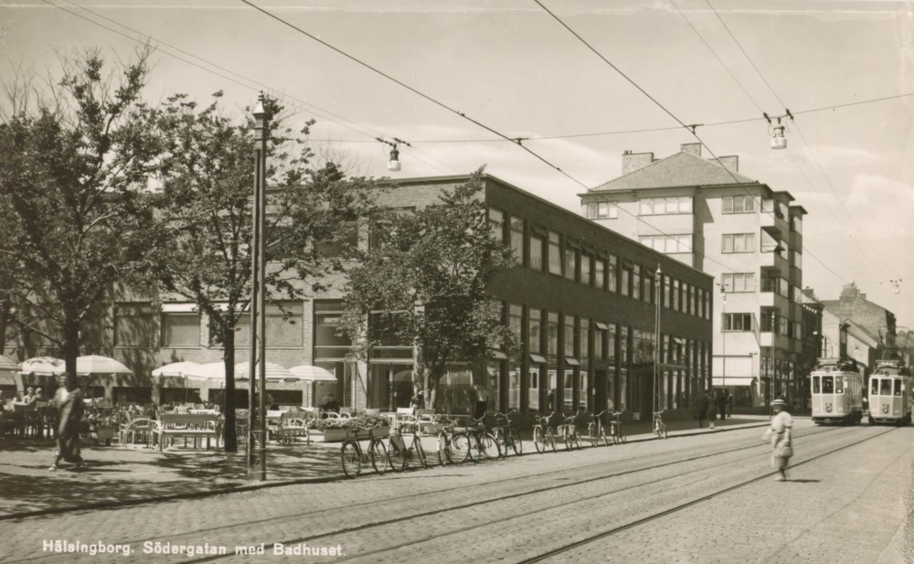 I förgrunden en gata med spårvagnsspår. Till vänster träd och uteservering där bakom simhallsbadet. I bakgrunden flervåningshus och två spårvagnar
