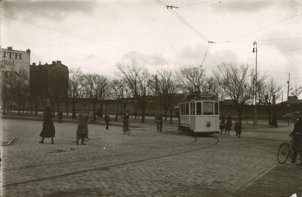 I förgrunden gatukorsning och spårvagns korsning, med en spårvagn. I bakgrunden träd och där bakom byggnader. Några människor rör sig i området.