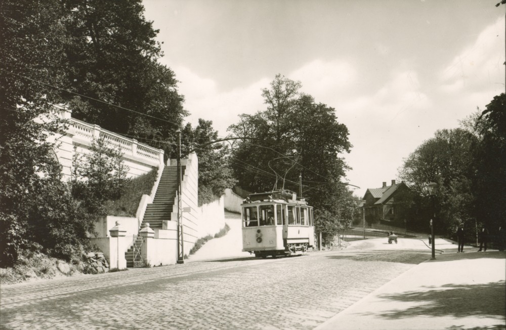 I förgrunden kullerstensgata med spårvagn, trottoarer på sidorna. I bakgrunden en mur med en trappa upp till Vikingsbergsvillan omgivna av träd. På höger sida träd och i bakgrunden en byggnad.