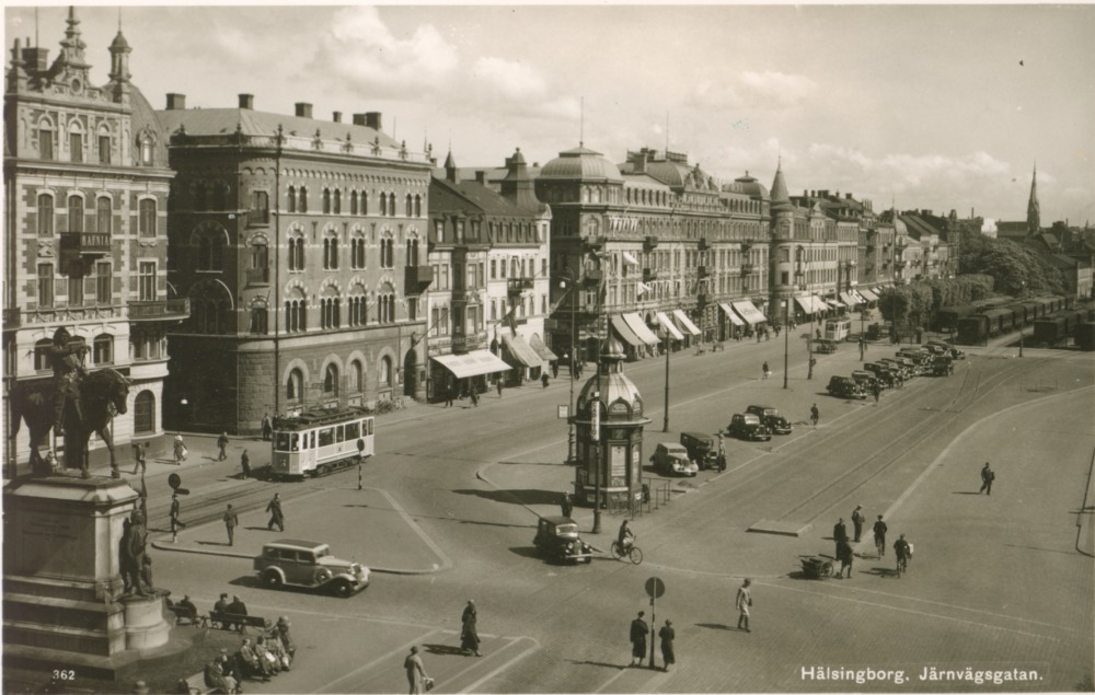 I förgrunden stadsgata och öppen plats med parkerade bilar. På vänstra vägen en spåvagn. I bakgrunden flervångshus med butiker i gatuplanet. I vänstra hörnet Magnus Stenbockstatyn. Människor sitter på bänkar och rör sig i området. Mitt i bild Pressbyråkiosken.
