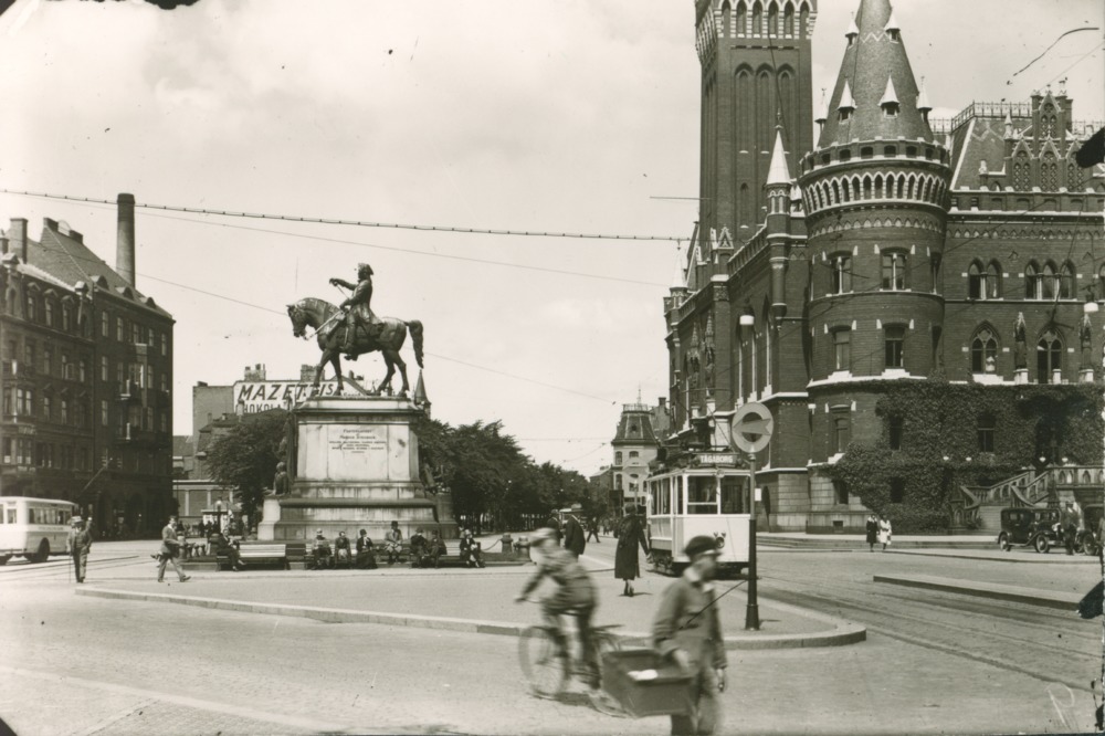 I förgrunden gatukorsning. Mitt i bild Magnus Stenbockstatyn. Männiksor på bänkar och på väg. Till höger Rådhuset och framför det en spårvagn. Till vänster flervåningshus.