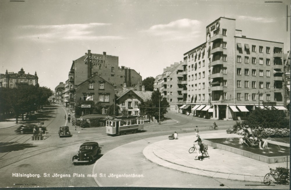 I förgrunden torg och vägkorsning, med bil, cyklist och spårvagn. På torget är en fontän, S:t Jörgensfontän. I bakgrunden flervåningshus med affärer i gatuplanet. På ett hus skylt med Zoégas kaffe.
