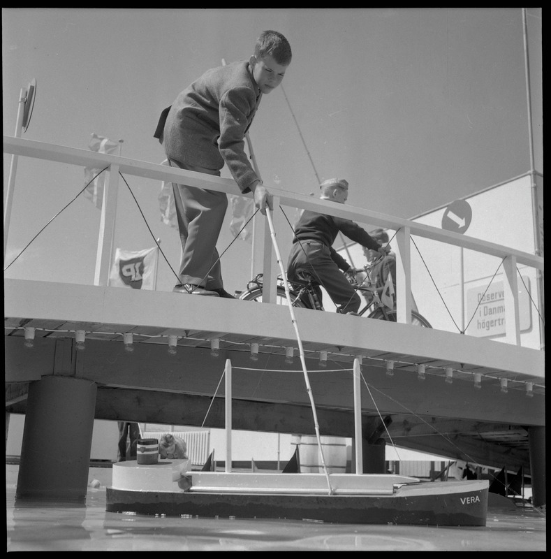 Bilden föreställer en del av en trafikskola med en bro över ett vattendrag med en modellbåt. På bron rör sig två barn.