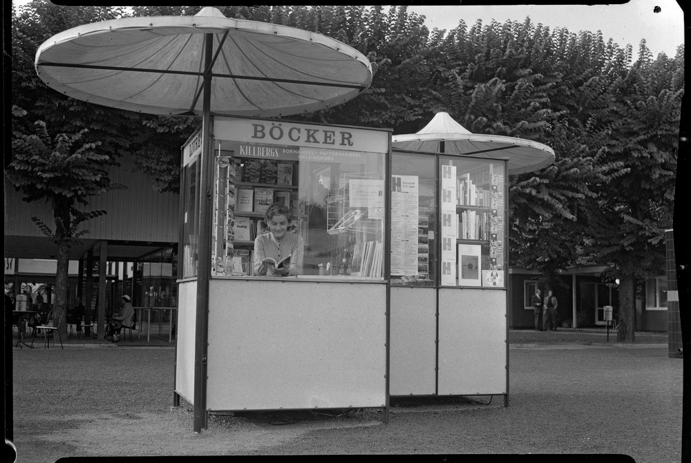 Bilden föreställer en liten kiosk på utställlningsområdet. På skylten ovanför kassan står det böcker samt Killbergs bokhandel och pappershandel Hälsingborg.