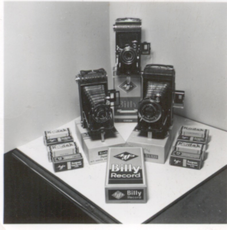 Fotografi som avbildar kameror och reklam för Billy Record i ett skyltfönster i Hefomas affär på Järnvägsgatan 3. Bilden är troligen tagen på 1940 eller 1950-talet.