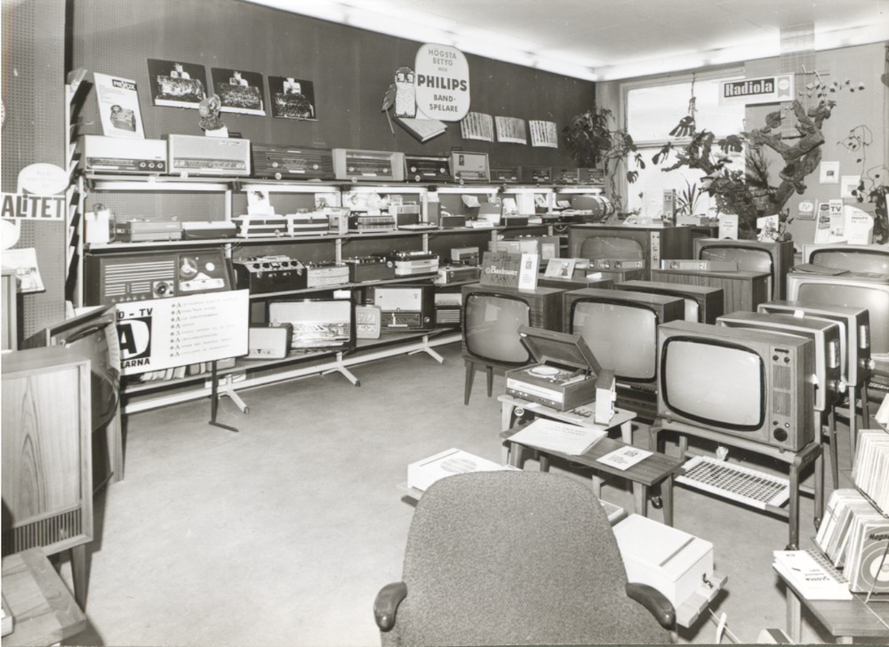 Fotografi som avbildar radio och tv avdelningen på andra våningen på Järnvägsgatan 3. Tagen efter ombyggnaden av affären 1957-58, troligen på 60-talet.