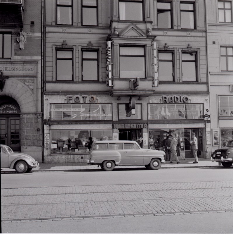 Fotografi som avbildar Järnvägsgatan med Hefomas butik. Bilden är tagen efter ombyggnaden av Hefomas fasad.