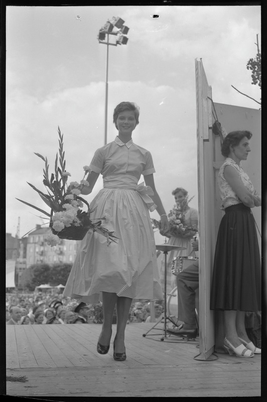 Bilden föreställer en kvinna på väg att lämna scenen med ett blomarrangemang i handen. Bakom en skärm står ytterligare en kvinna. I bakgrunden publikhav och byggnader.